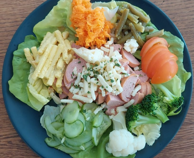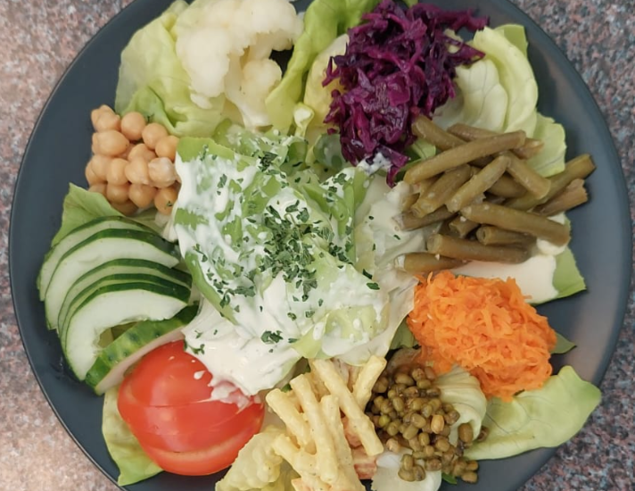 Reiscurry, Nudel, Quinoa, Rotkohl, Couscous, Blumenkohl, Bohnen, grüne Bohnen, Randen, Karotten, Tomaten, Gurken, Kraut und mehr... alles was das Herz begehrt kann auf unseren Salattellern serviert werden.
